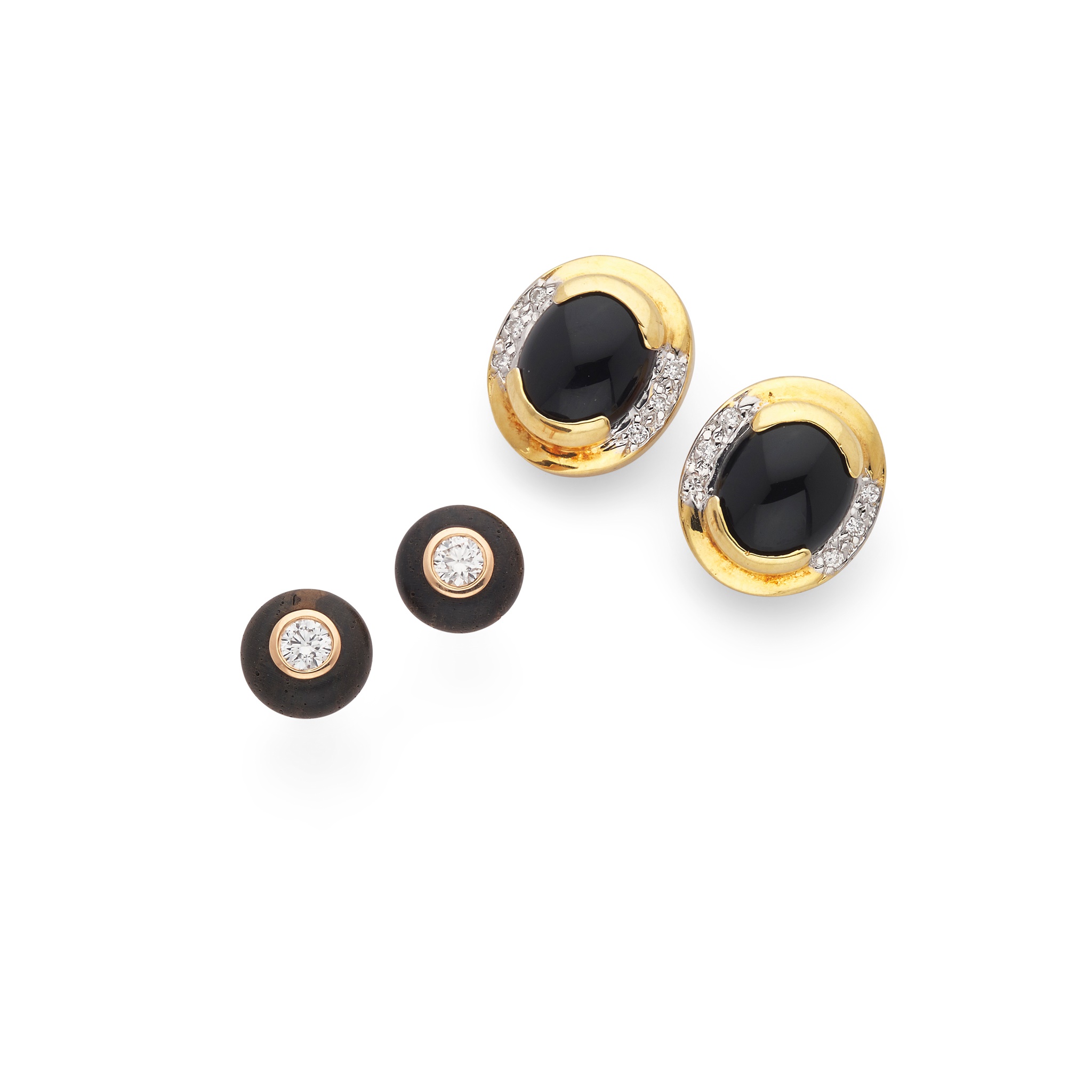 The first pair of oval outline, set with a cabochon onyx and small round brilliant-cut diamond detail, post and butterfly fittings, stamped 18k; the second pair each set with a round brilliant-cut diamond in a grenadilla wood border, post and butterfly fittings, modelled in 18ct gold (2)