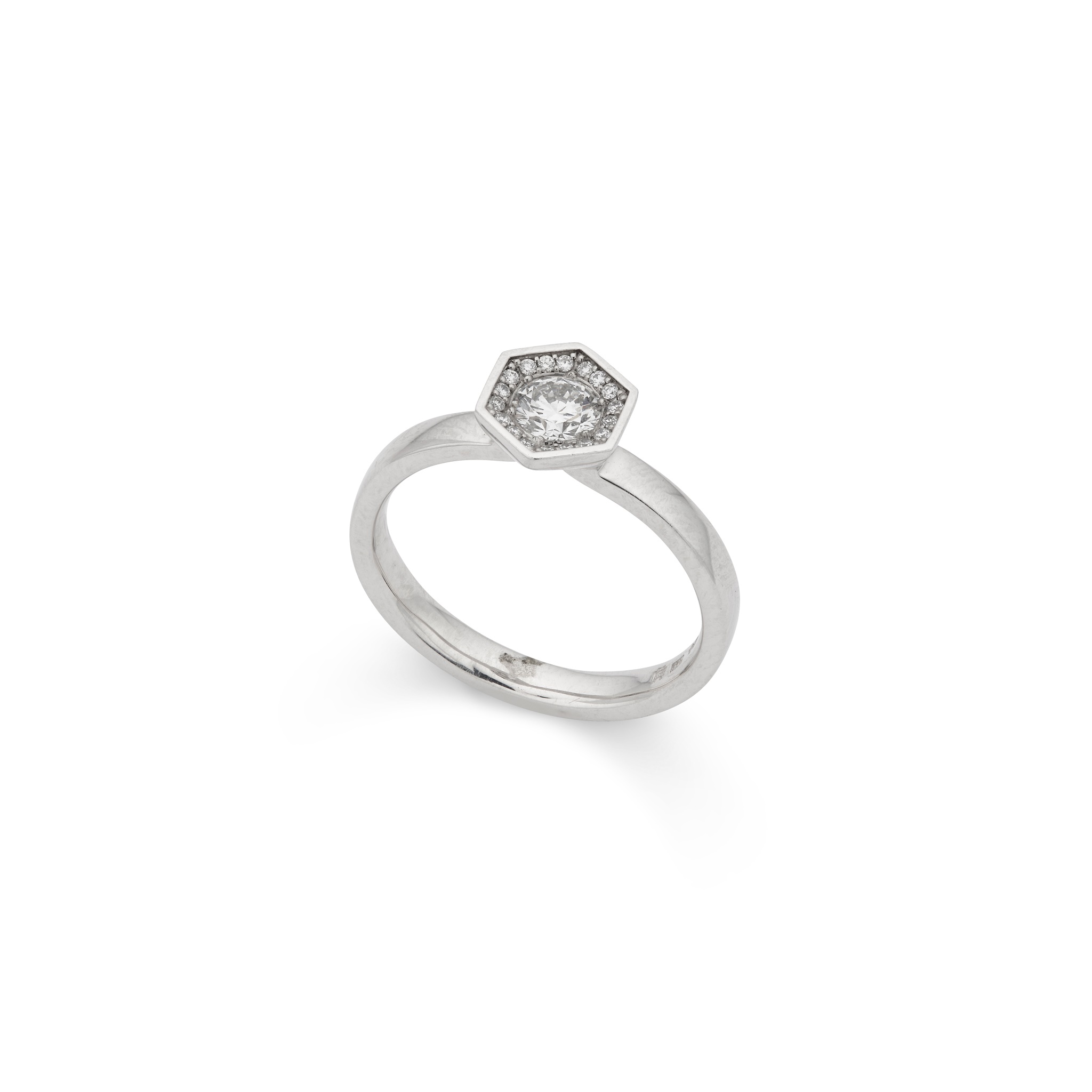 Claw-set with a round brilliant-cut diamond, weighing approximately 0.33cts, in a hexagonal border of small round brilliant-cut diamonds, UK hallmarks
