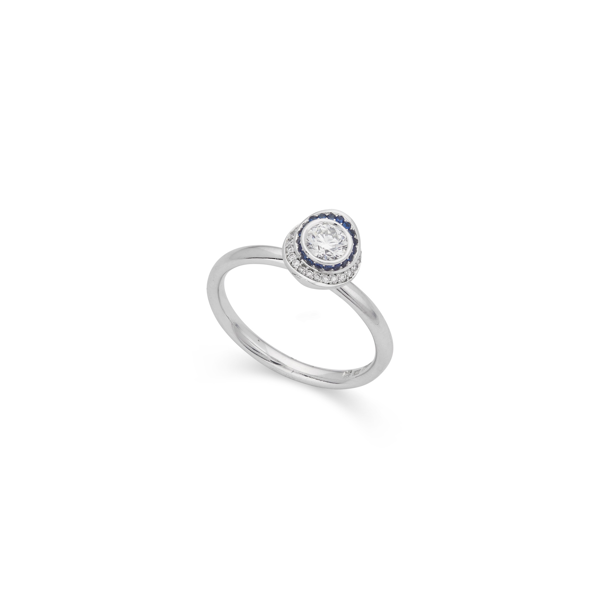 Collet-set with a round brilliant-cut diamond, in a border of round-cut diamonds and sapphires, UK hallmarks
