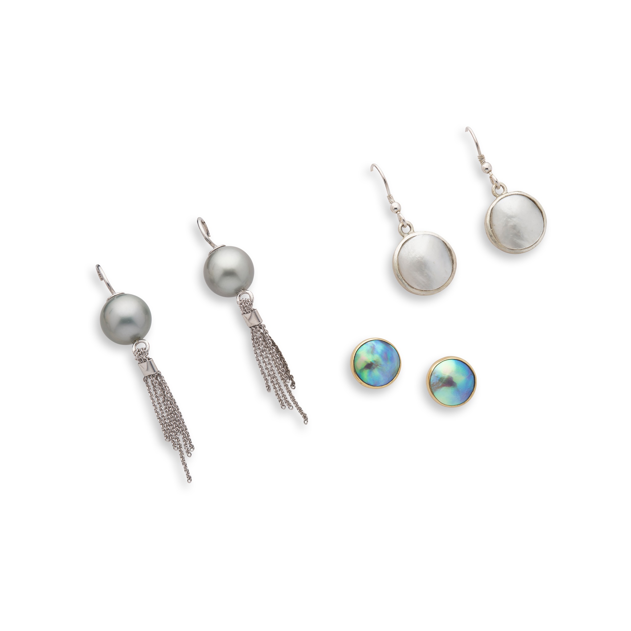 The first pair set with a Tahitian pearl suspending a trace-link chain tassel, hook fittings, stamped 925; the second pair each set with a mabé pearl, hook fittings, modelled in silver; the third pair each set with a blue-green mabé pearl, post and butterfly fittings, modelled in 9ct gold (3)
