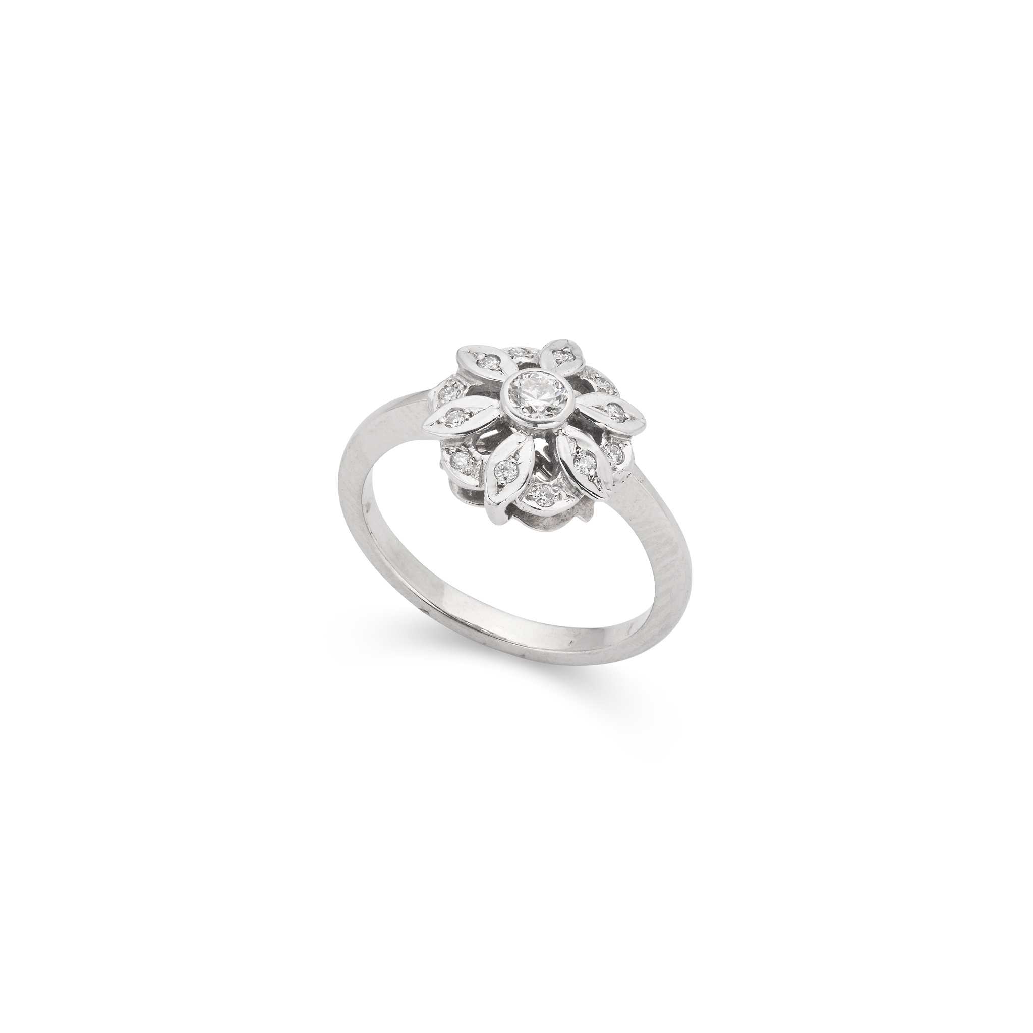 Collet-set with a round brilliant-cut diamond, in a floral surround set with smaller round-cut diamonds, UK hallmarks