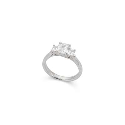 Claw-set with a cushion-cut diamond, flanked to either side by a cut-cornered rectangular-cut diamond, UK hallmarks