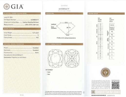 Accompanied by a GIA report no. 6435804619, dated 29th June 2022, stating that the cushion-cut diamond, weighing 1.21cts, is E colour, VS2 clarity, with no fluorescence