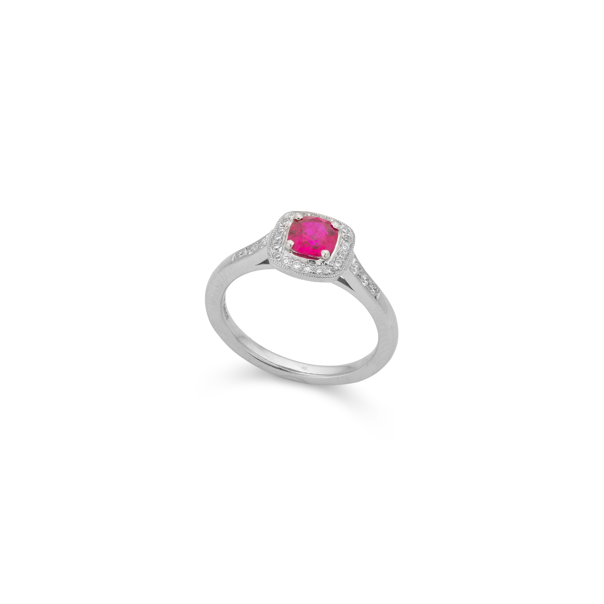 Claw-set with a cushion-cut ruby, weighing approximately 0.63cts, in a border of smaller round brilliant-cut diamonds, diamond set shoulders, UK hallmarks