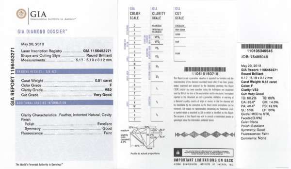 Accompanied by a GIA report no. 1156453271, dated 20th May 2013, stating that the round brilliant-cut diamond, weighing 0.51cts, is F colour, VS2 clarity, with faint fluorescence