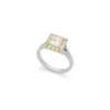 Claw-set with a princess-cut diamond in a border of round brilliant-cut fancy yellow diamonds, the shoulders set with small round brilliant-cut colourless diamonds, UK hallmarks