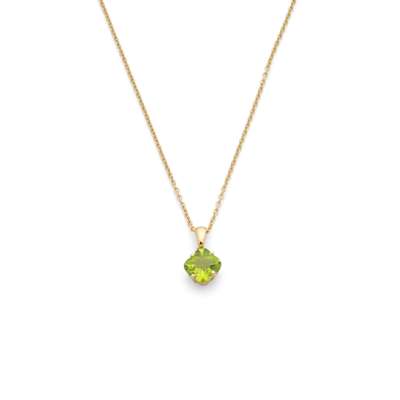 Claw-set with a fancy mixed-cut quatrefoil peridot, stamped 18k; to a trace-link chain, stamped 750