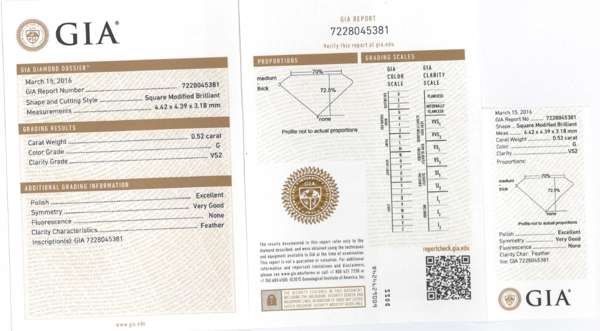 Accompanied by a GIA report, no. 7228045381, dated 15th March 2016, stating that the princess-cut diamond, weighing 0.52cts, is G colour, VS2 clarity, with no fluorescence