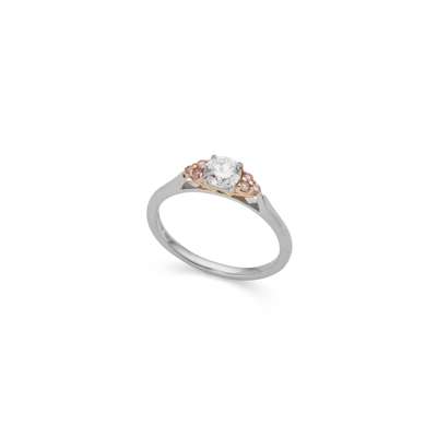 Claw-set with a round brilliant-cut colourless diamond, weighing approximately 0.45cts, each shoulder set with three round brilliant-cut fancy-pink diamonds, modelled in 18ct gold and platinum, UK hallmarks