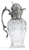 the flattened cut crystal body partially fluted, having leaf clasped C-scroll silver handle, the collar with C-scroll cartouches and floral detail, the domed hinged cover with pierced thumb piece