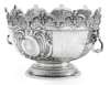 Britannia standard, of typical form with scalloped rim with mask finials above a chased frieze of foliate scrolls, the lower section with concave flutes with opposing oval cartouches surrounded by further scrolls, on cartouche engraved in script ‘In commemoration of the Mercer’s Company 13 Jan 1394’, with twin lion mask handles with hinged double-scroll loop handles, the whole on a stepped and domed foot with semi-spiral concave fluting, the plain rim engraved in script ‘Presented by the Mercers Company 13 Jan 1894’