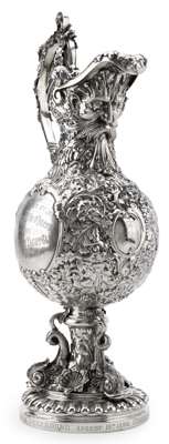 Like the famous 'America's Cup', fashioned by Garrards forty years earlier, the Queen's Cup given by Queen Victoria to the Royal Albert Yacht Club, Southsea, in 1890 is a silver wine ewer, probably - if any function was ever intended for it - for use as a claret, champagne or hock/moselle jug in the fashion of the day. By 1890, Queen Victoria had, for many years, given three cups annually for yacht racing: one went automatically to The Royal Yacht Squadron at Cowes, one was given to either a Scottish or Irish 'Royal' yacht club and one was given to an English 'Royal' yacht club - 'Royal' yacht clubs were those with a Royal patron or commodore, or both. In 1890, it was the turn of the Royal Albert Yacht Club, founded in 1865 and which had previously received a Queen's Cup in 1873, to receive a Queen's Cup - The Queen's gift to the club being ascribed by The Portsmouth Times and Naval Gazette of 23rd August 1890 to the 'co-operation of the commodore, H.R.H. The Duke of Edinburgh'. In 1890, H.R.H. The Prince Alfred, Duke of Edinburgh (1844-1900), second son of Queen Victoria, was an admiral in the Royal Navy and commander-in-chief at Devonport.