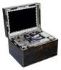 the brass line-inlaid case opening to reveal a well-fitted interior with seven silver mounted glass jars, four rectangular silver mounted glass boxes and a manicure set, the case with engraved white metal strap-work and hinges to the interior and two buttons to open two ‘secret’ drawers, one fitted with a writing slope, the other plain, the case with a Bramah lock and key, the fittings with all-over bright cut decoration
