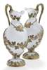 the glass body of ewer form, plain stem and spreading foot, the silver-gilt handle of naturalistic branch form onto a vine branch clasping the neck, the lower part with vine leaf and grapes clasping the main body, the base with a solid rim and further branch detail with leaves, the rim engraved ‘Green and Co. Fecit London’, each with a gilt spirit label Joseph Wilmore, Birmingham 1834, each of vine leaf form, pierced for ‘Claret’ and ‘Burgundy’ (2)