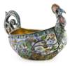 the prow in the form of a cockerel’s head, his elaborate tail forming the openwork handle, the body decorated with scrolling flowerheads on cream and pale-green grounds, the rim with a geometric design of alternating oval panels of foiled lime-green enamel and filigree swirled pellets, rope-twist borders, the base inscribed ‘Moskau zum 11 November 1910’