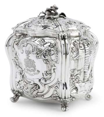 of serpentine bombé form, with floral finial to the Chinoiserie decorated pull off cover, the sides similarly decorated and one with a coat of arms and motto ‘Benefictorum Memorum’ (Mindful of favours), all within a C-scroll and floral cartouche, the opposing cartouche blank, all on scroll feet, engraved to the underside ‘From Mrs. Temple to her niece Mrs. Kelham’