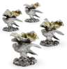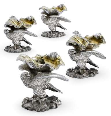the salts modelled as large parcel gilt clam shells, supported on the back of a standing eagle with its wings stretched and standing on a rocky base (4)