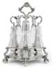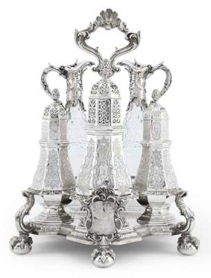 the frame of four eagle’s masks, acanthus and claw and ball feet, with central baluster handle and reeded shell, scroll handle, the base with similar chased border, the front with a foliate scroll and diaper work cartouche, engraved with a coat of arms, fitted with three octagonal lidded casters, each on a spreading octagonal foot, the covers and with pineapple finials, two pierced, one blind, the bodies chased with panels of shells, scrolls and flowers on a matted ground; two silver-mounted cut glass bottles, with silver neck mounts chased with scrolls and foliage and each with leaf-capped scroll handles and hinged domed covers, two casters engraved with a crest, the large caster and the bottle covers engraved with a crest and motto (6)