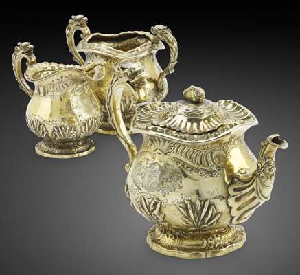 additionally stamped ‘Storr & Mortimer’, comprising: a teapot, a milk jug, a twin-handled sugar bowl, the bellied bodies with embossed and chased borders of shell and fluting, with scalloped everted shell detailed rims, the lower border of rushes, the central vacant border engraved with scroll-form cartouche with stag’s head facing with shell surmounting, the teapot with domed fluted shell detailed cover with conch shell finial, the S-scroll handles formed as serpents rising from rushes (3)