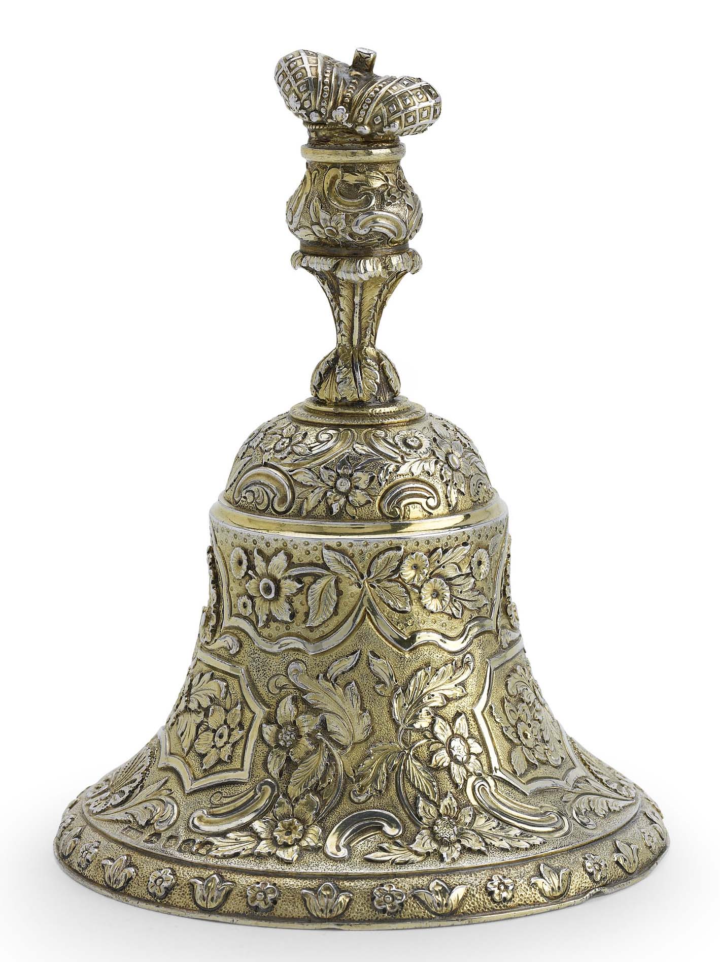 the cast body chased with shells, flowers and foliage against a matted ground, the handle formed as four plumes rising to a cushion knop chased with scrolls and flowers surmounted by a finial formed as a marquess’s coronet