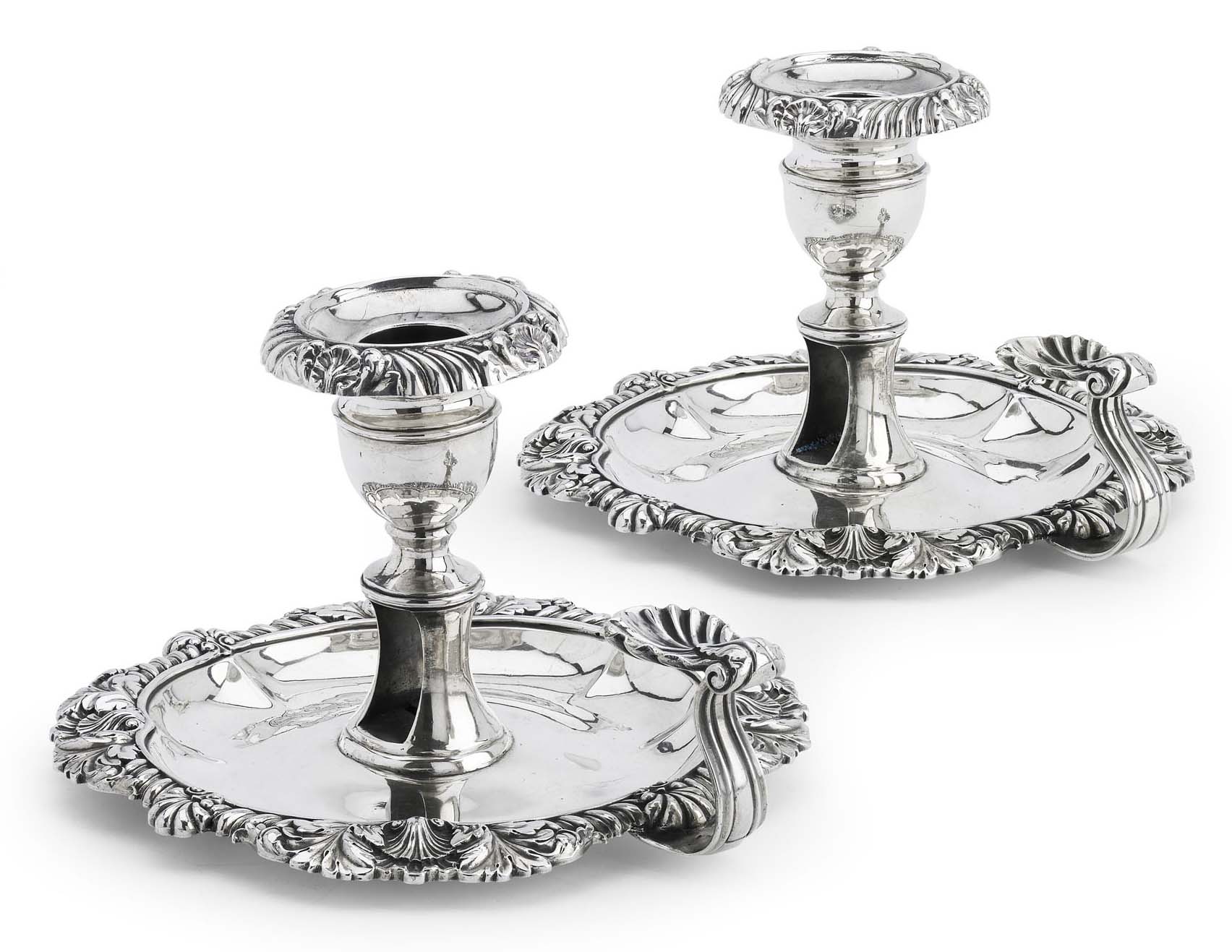 the shaped circular bases with cast leaf and gadrooned border, shell and moulded handle, the lobed centre engraved with a crest and with an urn-shaped sconce with reeded and gadrooned edge (2)
