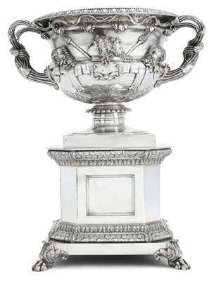the twin-handled vase of shallow kantharos form on a short circular stem onto a spreading square base, the body chased with a calyx of acanthus banding to the blower half and with typical masks, lion pelts, clubs and spears, the handles formed as intertwined vine leaves, raised on simple square foot, the stand of canted square section with shamrock leaf border above an acanthus leaf frieze, the sides with four plain panels with matching borders, raised on four claw and pad feet with acanthus caps