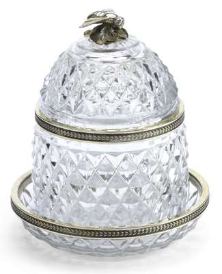 the hobnail cut body, cover and dish with simple silver-gilt mounts with chased foliate detail, the cover with a cast gilt bee (unmarked) (2)