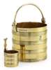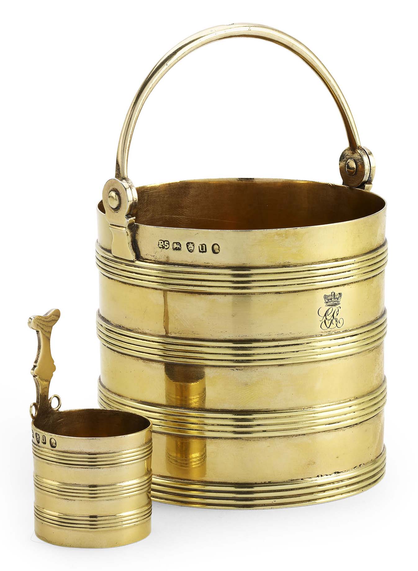 the pail of coopered form, simple loop handle, engraved with a coronet and monogram, also with an engraved initial in an oval to the underside, the ladle modelled as a smaller pail, similarly coopered and with an upright handle of shaped form (2)