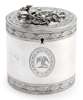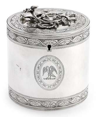 of simple cylindrical form with finely engraved borders of intertwined branch and garlands with star motifs between, with bright cut oval cartouche to centre below key hole with a crest of a pelican in piety, the flat flush hinged cover with identical border and with well formed branch foliate and flower head finial