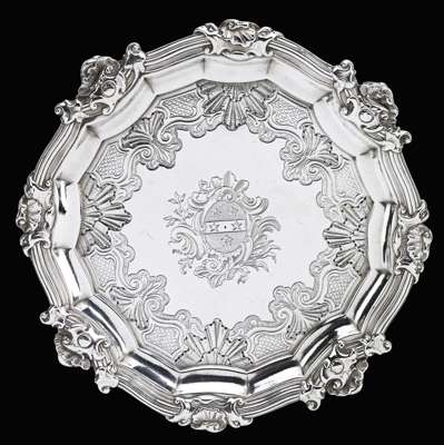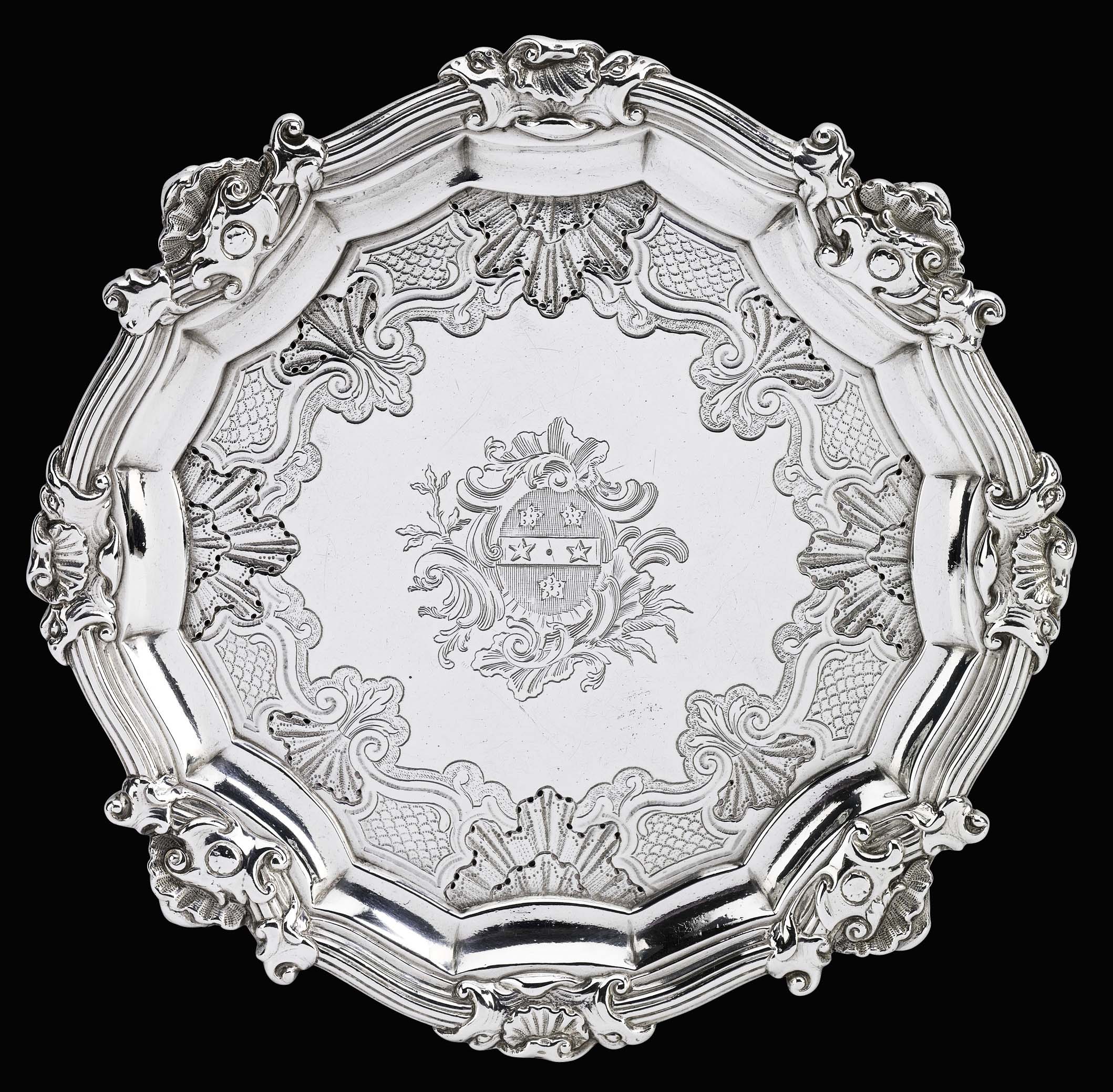 of shaped circular outline with reeded border, scroll and shell points, the flat finely chased with a border of scroll and shell detail, flanked by cartouches of cross hatched fine stipple chasing, the centre engraved with detailed armorial, all raised on four acanthus bracket feet (2)