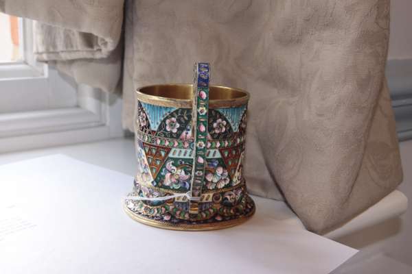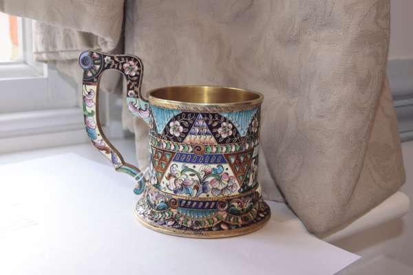 A Russian silver-gilt and shaded cloisonné enamel tea-glass holder