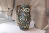 the cylindrical shaped-oval body with four circular reserves of stylized scrolling polychrome foliage on a dark-green ground, the borders with flowerheads and floral sprays, and with geometric motifs, the exterior of the handles similarly decorated
