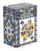 decorated with the King of Clubs as a Bogatyr within a stylized foliage geometric border, the sides and hinged lid decorated with foliate scrolls and geometric motifs in the manner of Fedor Rückert on a turquoise-blue ground, the gilt interior lined with velvet
