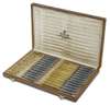 the handles decorated with enamel in the art nouveau style on a blue-grey ground, with workmaster’s initials and K.Fabergé beneath Imperial Warrant, 88 standard, in the original silk and velvet-lined wooden box, the interior of the lid marked K.Fabergé, Moscow, St. Petersburg, Kiev, Odessa, London (24)