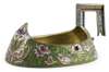 extensively decorated with shaded cloisonné scrolling foliage on a deep green ground, the flower heads set with cabochon hardstones, the prow enamelled with a stylized double-headed eagle on a pink ground, the square handle with flowers and a band of geometric decoration