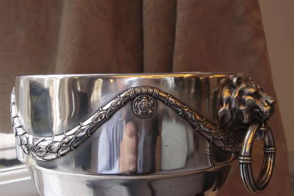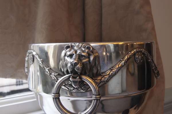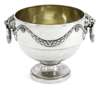 the hemispherical bowl on flared, stepped base with a collar of laurel leaves, the rim with laurel swags hung from foliate rosettes, cast with lion-mask drop-ring handles, gilt interior, marked in full beneath Imperial Warrant, scratched inventory number 32234