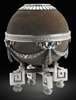 the sandstone sphere with silver-lined recess for the matches, and with four Greek key pattern supports on disc feet, a central band with ribbon scrolling and suspended with ribbon-tied swags, marked K.Faberge beneath Imperial Warrant, scratched inventory number 4687, 88 standard