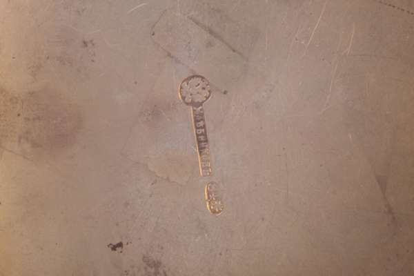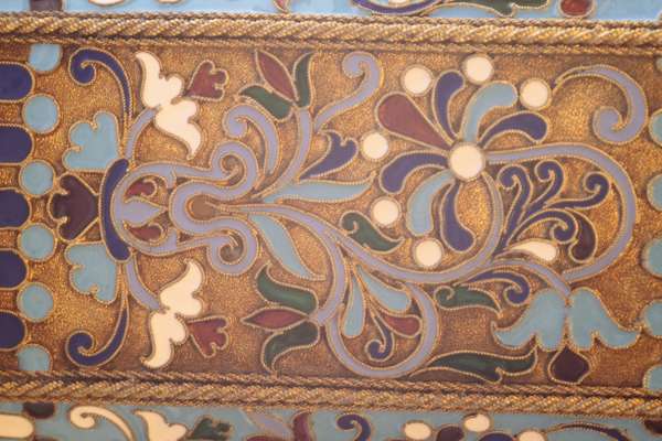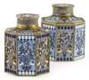 of octagonal form, enamelled with panels of scrolling foliage, alternating on blue enamel and gilt stippled ground (2)