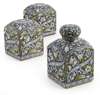 each extensively enamelled with scrolling foliage predominantly in shades of blue and green, the lower border with a band of geometric decoration, the caddy with a domed cover and silver-gilt mounted cork stopper with articulated handle, the sugar boxes with hinged, domed lids, the borders with blue beads (3)