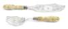 the knife with large shaped blade with finely chased scene to obverse of the body of Hector dragged behind the chariot of Achilles, the reverse with oval cartouche with engraved crest, flanked by two seated figures mermen with naturalistic back ground, the four-tined fork with scene of a crouching female figure to obverse and reverse with oval cartouche formed from the tails of two young mermen with head of Neptune, the tines with foliate and floral details, both socket mounted with interlaced design to the ivory handles with high relief carving of spiralled sea serpents around grip and with beaded rim (2)