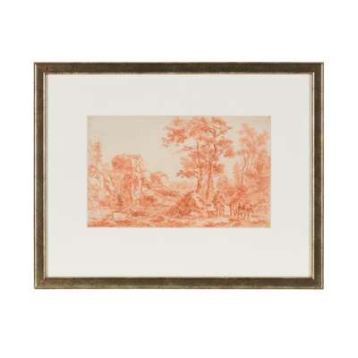 Like his teacher, Jan Both, who he often emulated in his compositions, de Heusch painted romantic visions of the Campagna; the Italian countryside around Rome. Unlike Claude Lorrain, whose work from his time in Italy was highly influential to de Heusch, Willem rarely introduced biblical scenes into his landscapes, choosing to depict the utopian dream instead. This original red chalk sketch and the following oil on panel of this Italianate Landscape evokes the Arcadian world that de Heusch is known for.