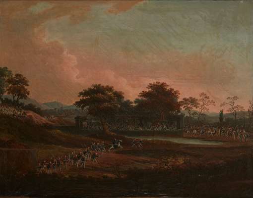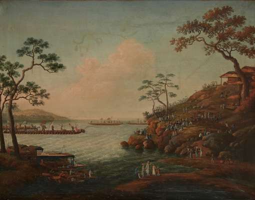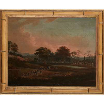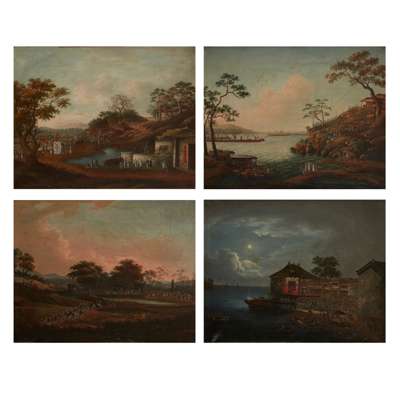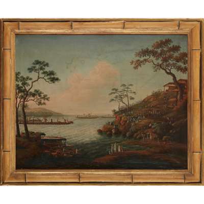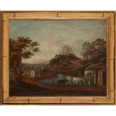 This set of paintings are an unusual combination of subjects in distinctive faux bamboo frames. The first painting depicts dragon-boat racing, although first recorded in the Song Dynasty and still practised world-wide, it is however a rare subject for China Trade painters. The view of competing boats disappearing from view around a headland as crowds of onlookers watch from the cliff-tops would have been a dynamic visual record of life in China for a returning merchant or sea captain. Another surprising composition is the fourth scene, which depicts an armed conflict between warring Chinese factions. It is tempting to suggest that the painting depicts The Taiping Rebellion, the civil war waged between the ruling Qing Dynasty and the Hakka-led Taiping Heavenly Kingdom between 1850 and 1864. However, it is not entirely clear as although some soldiers wear the typical uniform of red jackets and blue trousers of the Taiping forces, by no means all are, and the opposing side’s uniforms are not readily identifiable. This raises further questions as to why Chinese artists, although painting for the export market, would choose to depict such a sensitive subject - an armed insurrection against the ruling dynasty. A conflict contemporary with the height of popularity of China Trade paintings, this scene could have been in commemoration of a successful, important victory for the Qing dynasty – a message to the world that the Qing Dynasty was strong and that this conflict was inconsequential.