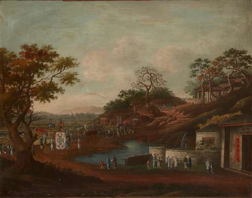 Note: Produced in response to the growing Western demand for ‘exotic’ goods in 18th and 19th centuries, China Trade paintings were made as souvenirs for the European and North American merchants visiting Chinese trade ports. Showing scenes from Chinese life, these paintings portrayed subjects which were likely to be of interest to Western visitors such as Chinese flora and fauna, imperial and bureaucratic scenes, and locations most often visited by foreign merchants such as the factories in Canton, the Pearl River and Macau. Some scenes were even inspired by, or copies of works by, European Old Masters. Catering to Western tastes, the style of these paintings is an amalgamation of Chinese and Western aesthetics.