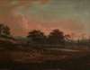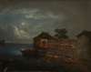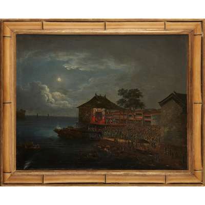 Oil on canvas, and three others, a set of four: 'Chinese New Year procession', 'Military skirmish' and 'Open-air theatre at night,' each in a faux bamboo frame