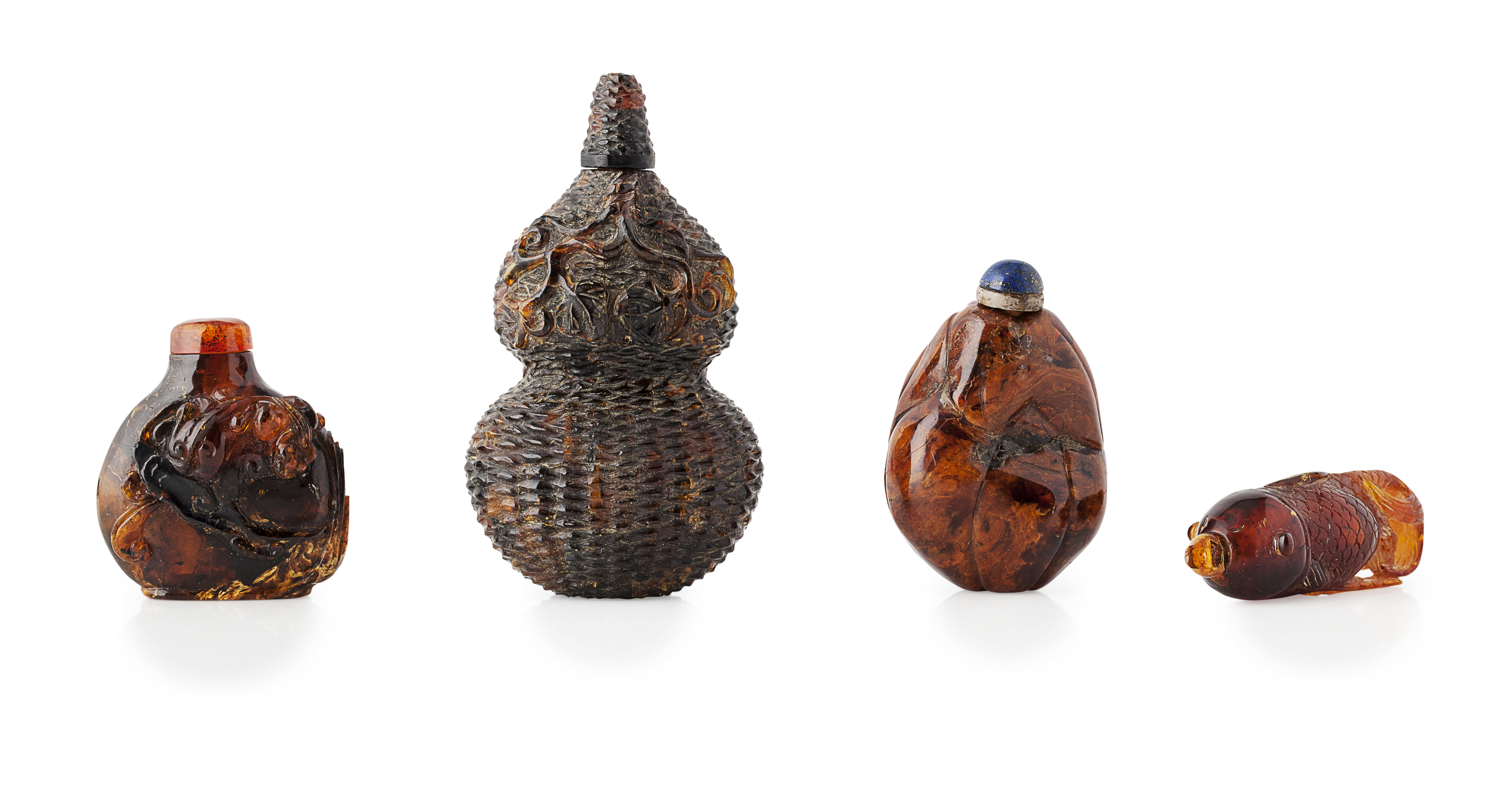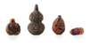 comprising; a basket-weave decorated double gourd bottle, one single fish bottle, one bottle with mythological animal in a tree, one of melon form (4)