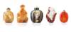 one bottle with flower in relief, the reverse with bird, one bottle of plain melon form, one bottle in the form of a leaping fish, one bottle with boy and peach, the reverse with mythological animals, one bottle with a lady resting on a rock (5)