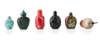comprising; a coral baluster form bottle, a small turquoise bottle, a malachite bottle carved on both sides with a boy holding a fish, a black hardstone bottle with carved frogs, a hardstone bottle with jade dragon decoration, and an agate fruit-form bottle (6)