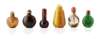 comprising; two aventurine-type plain bottles, a pink and dark pink splash bottle, a long ovoid white bottle, a shell form green glass bottle, a white baluster bottle, a yellow glass bottle, a clear colour splash bottle, a white bottle with yellow mask handles, a mottled glass bottle imitating mammoth tooth, and a dark faux tortoiseshell bottle (11)