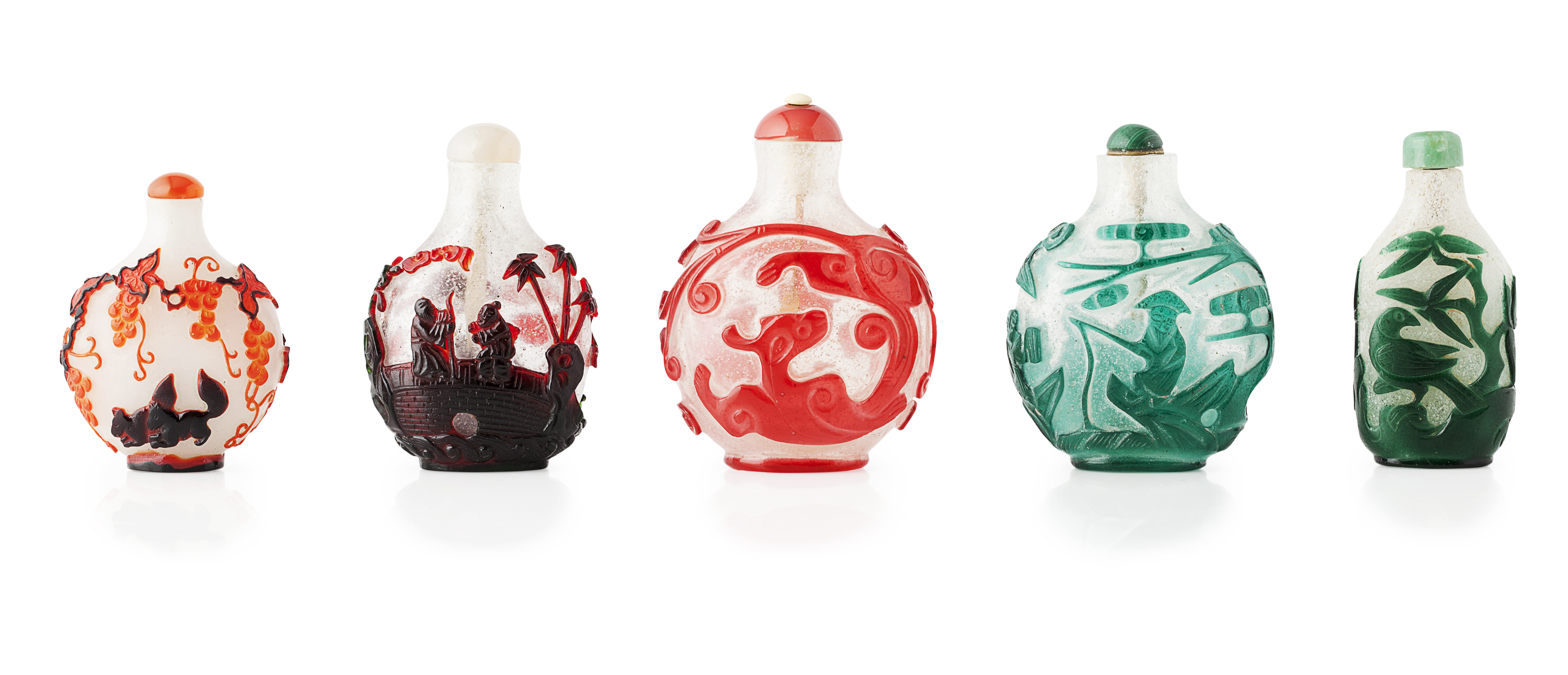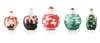 comprising; a bottle with red chilong decoration, a bottle with green bird decoration, a bottle depicting Go players on one side and a fisherman on the other in dark green, a bottle depicting a crane flying above a pavilion on one side and figures walking on a bridge on the other in dark red, and a bottle with orange and purple decoration of squirrels beneath grapes suspended from vine branches (5)