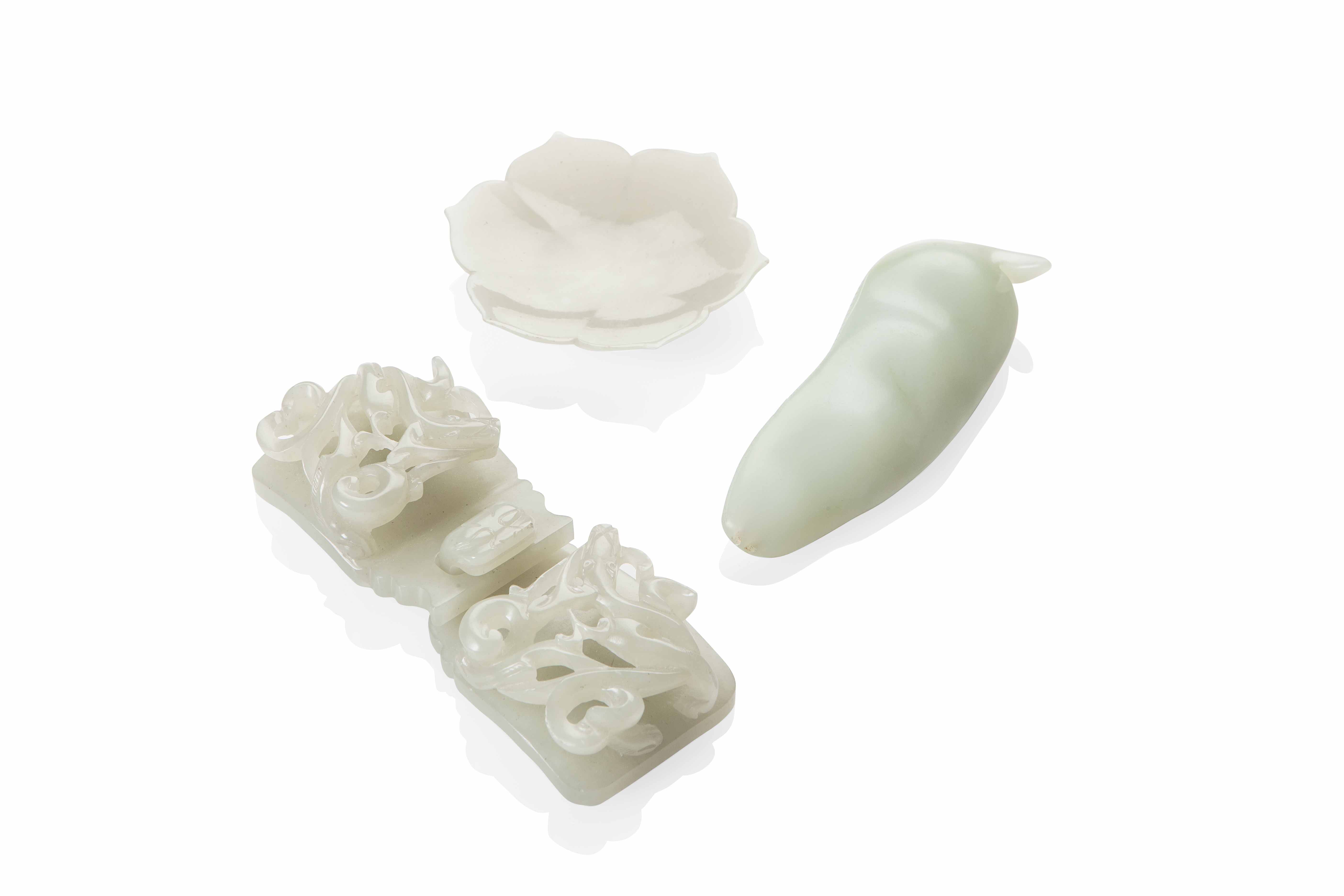 comprising; a celadon jade chilong dragon belt buckle, a Mughal type creamy celadon floriform dish and a light green jade pea pod pendant (3)